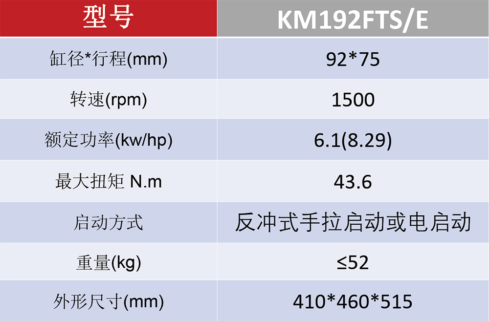 型号:KM192FTS/E 功率:6.1KW/8.29HP 排量:0.499L