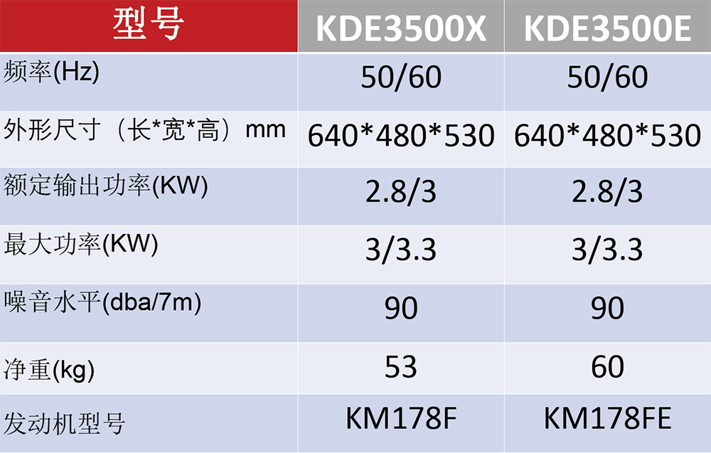 型号:KDE3500X/E 功率:2.8KW 发动机型号:KM178F/E