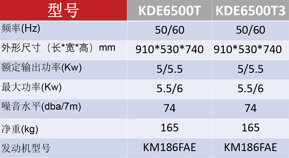 型号:KDE6500T/T3 功率:5KW 发动机型号:KM186FAE