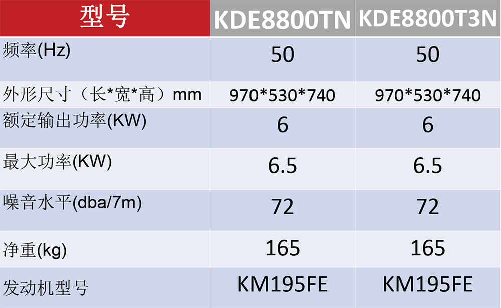 型号:KDE8800TN 功率:6.0KW 发动机型号:KM195F